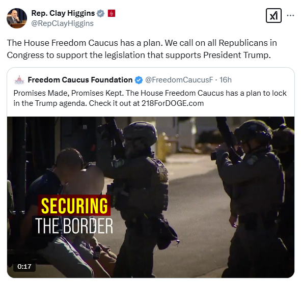 WASHINGTON, D.C. – House Freedom Caucus Board Member Congressman Clay Higgins (R-LA) reiterated his support for the Emergency Border Control Resolution, a budget that begins the reconciliation process and delivers on the America First Agenda. Congressman Higgins is an original co-sponsor of the bill being led by the House Freedom Caucus.